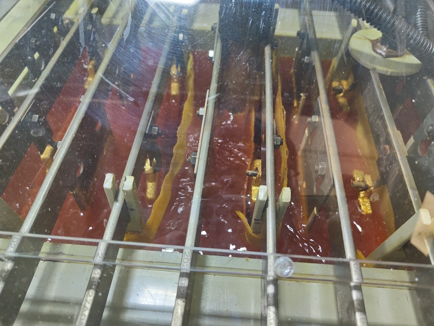該工藝具有過(guò)程穩(wěn)定,易于控制,污染小,勞動(dòng)強(qiáng)度小等優(yōu)點(diǎn),但是存在生產(chǎn)周期長(zhǎng)(時(shí)間是化學(xué)法精煉的2-3倍),電解液金占?jí)捍螅?/span>10kg/d金電解,電解液中共計(jì)占?jí)狐S金4kg左右)